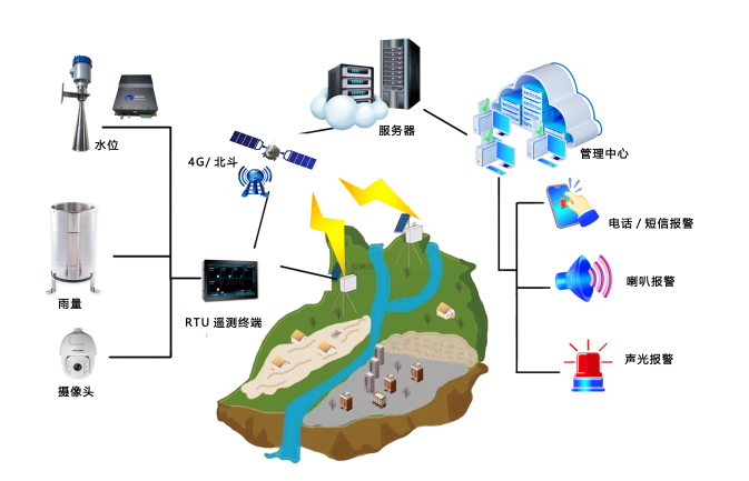 水雨情监测站国标翻斗式雨量计,雷达或气泡水位计,高清视频摄像机,RTU遥测终端机,现场数据通过4G/5G/NB-IoT无线网络远传至监测预警平台,也可扩北斗卫星通讯装置。