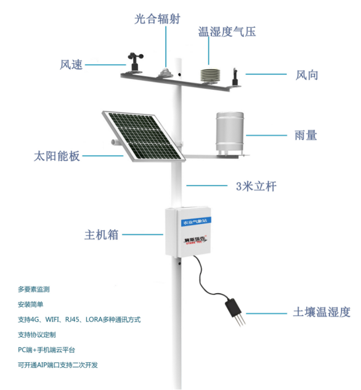 STK-ZH13农业气象站主要用于采集、实时监测空气中的温度、湿度、光照强度、风速风向、降雨量、土壤温湿度等农业气象参数。所采集的农作物信息可随时传输到实验区数字显示平台,可对农业物长势、墒情、苗情、虫情等进行可视化远程自动监测,为科学指导农业生产提供及时准确的依据。为农业生产工作者提供准确的气象信息,帮助农业生产能够顺利的进行,保护农作物的生长等。